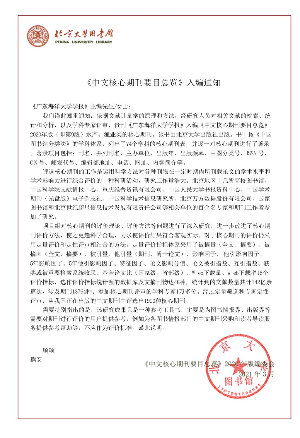 近日,接到《中文核心期刊要目总览》2020年版编委会通知,《今年会官方网站学报》入选《中文核心期刊要目总览》(2020版)水产、渔业类核心期刊。这是今年会官网学报首次入选中文核心期刊,标志着今年会官网学报跻身国内优秀期刊行列,这在今年会官网学报发展史上具有里程碑意义。