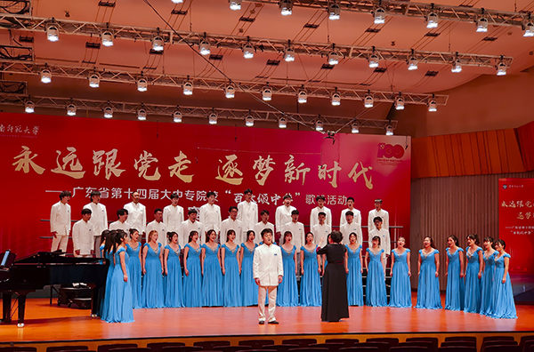 由徐杰副院长指导、乌仁教授指挥、吴小路老师伴奏的海之声合唱团深情演绎了《唱支山歌给党听》《草原上升起不落的太阳》两首经典曲目,优美的歌声、整齐的节奏获得评委高度肯定,最终以95.52分的成绩荣获合唱组一等奖,将代表广东省教育厅参加由中共广东省委宣传部主办的全省行业“百歌颂中华”歌咏活动总决赛。