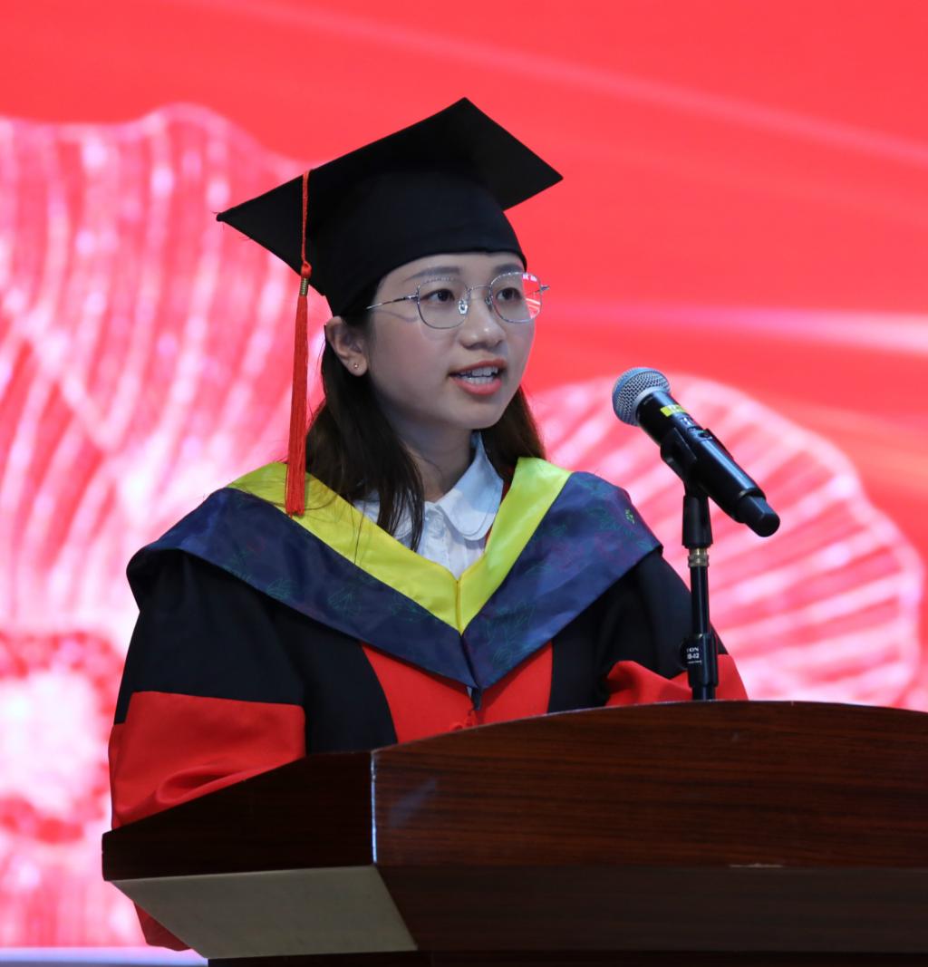 水产学院王蓓教授、食品科技学院博士毕业生邓义佳、数学与计算机学院软件工程专业卓越1171班陈镕浩分别作为教师、研究生和本科毕业生代表发言。王蓓勉励毕业生要把回报祖国当作终身的志向,努力做有责任、有担当的人,乘风破浪,逐梦前行。邓义佳感谢母校和恩师益友对自己的培养,表示要牢记校训,秉承海大精神,勇于担当历史责任,为母校增光添彩。陈镕浩分享了他在大学四年的学习经历,表示十分感恩母校给予自己的一切,自己对未来充满信心。