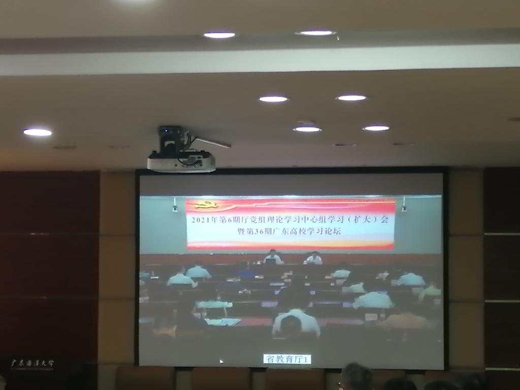 7月22日下午,广东省委教育工委举办第36期广东高校学习论坛,省委教育工委委员,省教育厅党组成员、副厅长、一级巡视员朱超华主持本期学习论坛,学习论坛以视频会议形式举办。学校党委书记曹俊明、党委副书记林晓敏、副校长刘东超和谭北平,党委常委、组织部部长林宇,学校党史学习教育领导小组和办公室成员,各职能部门、院系党组织负责人等共计36人,在湖光校区行政楼五楼会议室以集中观看视频的方式参加本期学习论坛。
