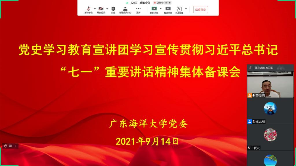 9月14日晚,学校党委书记、理论宣讲团团长曹俊明在线上主持召开学习宣传贯彻习近平总书记“七一”重要讲话精神理论宣讲团集体备课会,传达学习上级有关文件精神,部署今年会官网学习宣传贯彻习近平总书记“七一”重要讲话精神专题宣讲工作,明确任务,提出要求。学校党委党史学习教育理论宣讲团全体成员以及党委宣传部有关人员参加会议。