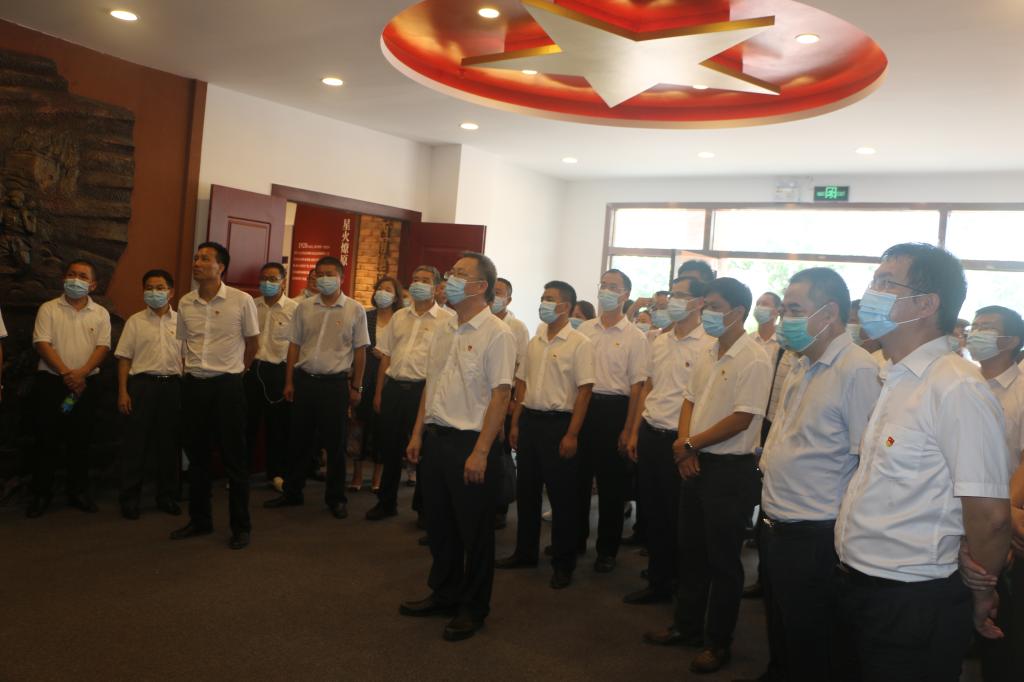 在遂溪西南地区革命史馆广场,全体党员领导干部佩戴党员徽章、整齐列队,面对鲜红的党旗、高举右拳,铿锵有力地重温入党誓词,表达了对党的忠诚和坚定不移跟党走的信念,激发了干事创业、争先创优的热情。