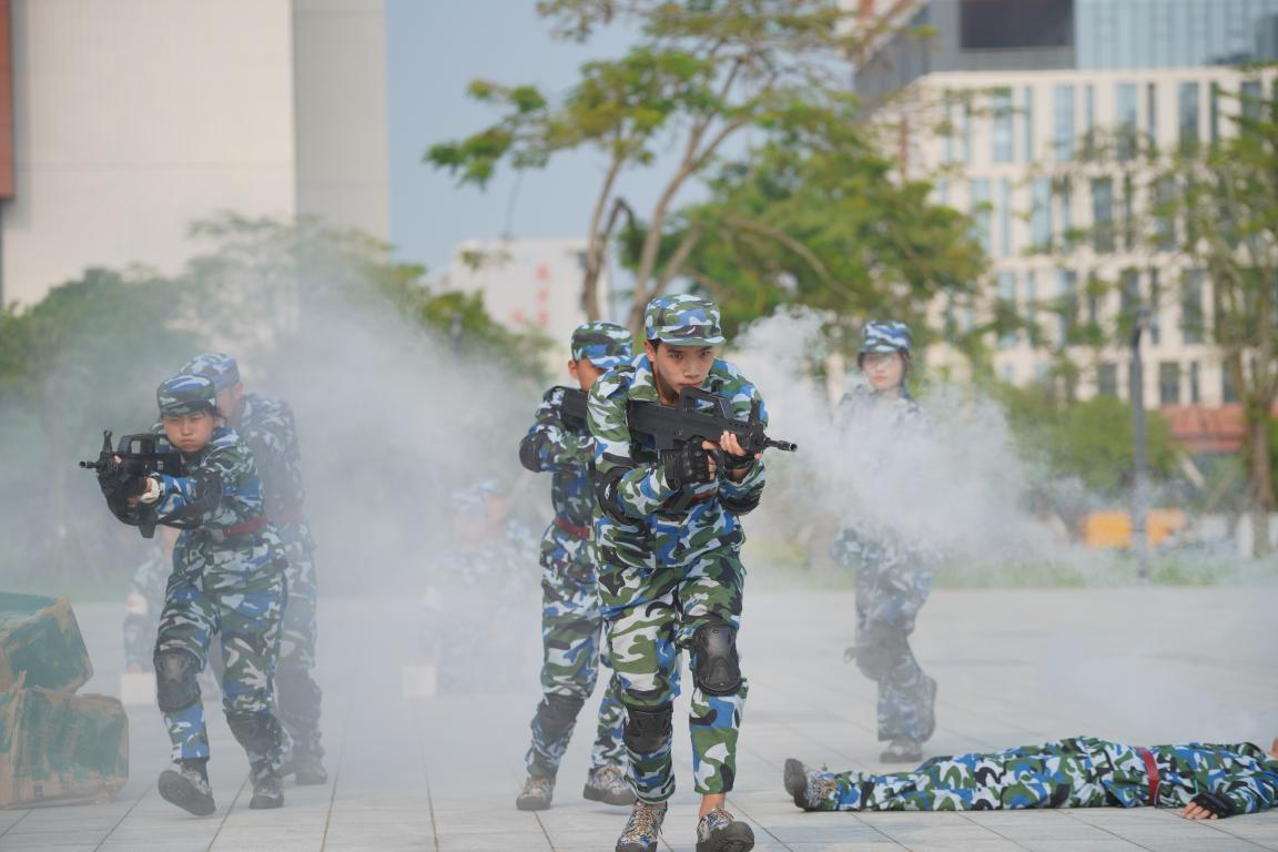 在军训成果汇报展示中,参训同学进行了捕俘拳、匕首操、擒敌拳、短棍术、匕首操、人质营救等特色科目展演,整齐划一的动作展现出刻苦训练的成效和朝气蓬勃的青春风采,其中花样方阵以红黄彩板变幻出“为党育人 为国育才”“我❤中国”“100”“党徽”“强国强军”“追梦人”“广学明德 海纳厚为”等字样和图案,用特殊方式向建党百年献礼、向伟大祖国告白,震撼人心的表演赢得了与会师生的阵阵喝彩。退役复学大学生士兵拳术方阵进行了拳术格斗表演,彰显了退役不褪志、退伍不褪色的军人本色。