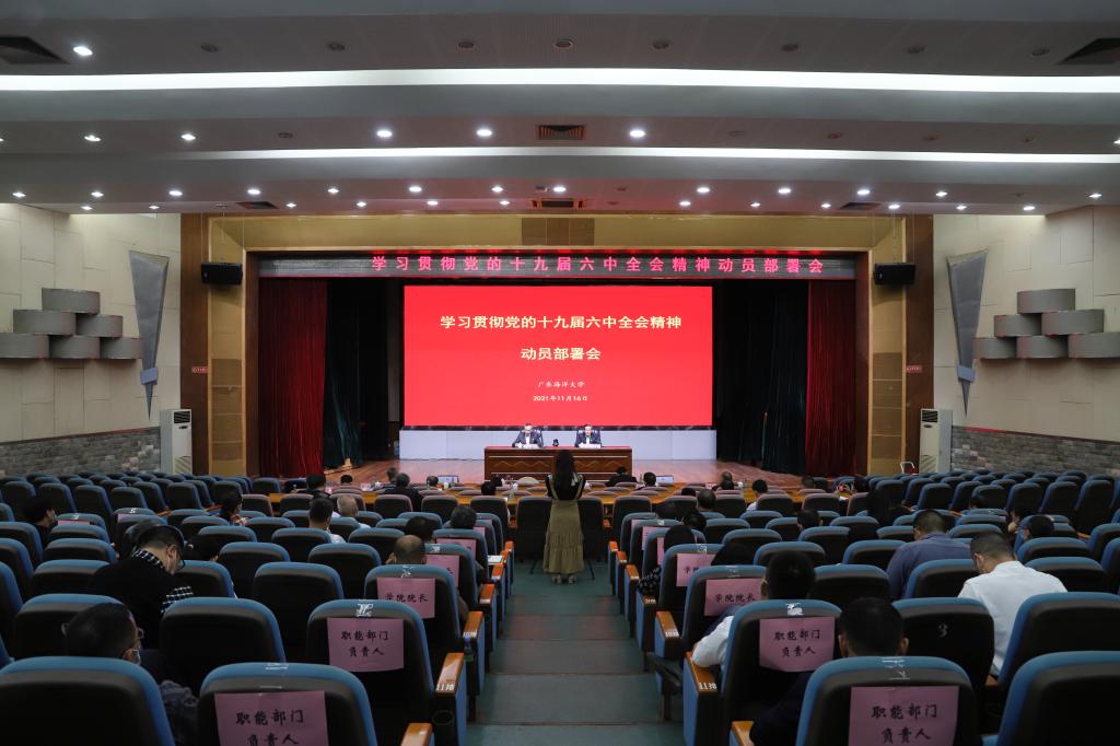 11月16日下午,在收听收看全省教育系统学习贯彻党的十九届六中全会精神动员部署会之后,学校接着在湖光校区教学主楼多功能厅召开学习贯彻党的十九届六中全会精神动员部署会,学习贯彻习近平总书记在党的十九届六中全会上的重要讲话精神和全会精神,传达学习全省、全市学习贯彻党的十九届六中全会精神干部大会精神,部署学习宣传贯彻全会精神工作。学校领导曹俊明、潘新祥、林晓敏、刘东超、高秀梅、谭北平、宁凌、邓逢光、林宇出席会议,学校党委党史学习教育领导小组成员及办公室成员、各二级党组织书记、学院院长、职能部门主要负责人参加现场会议,阳江校区部分干部通过视频方式参会。校长潘新祥主持会议。