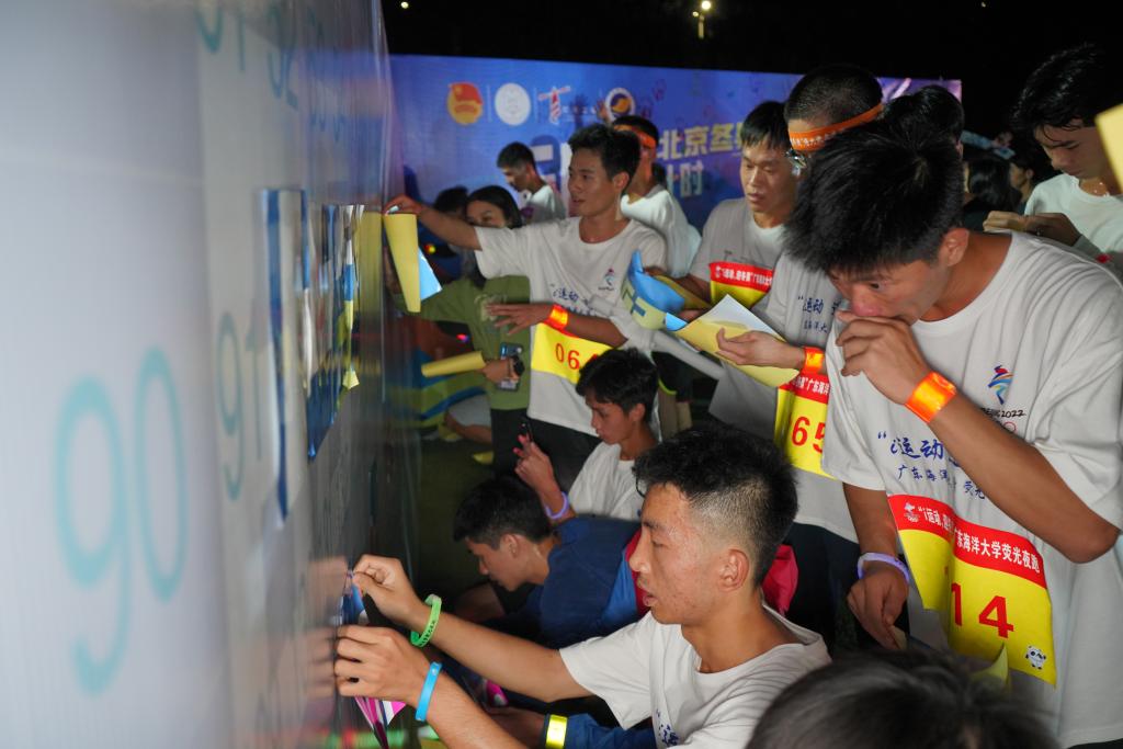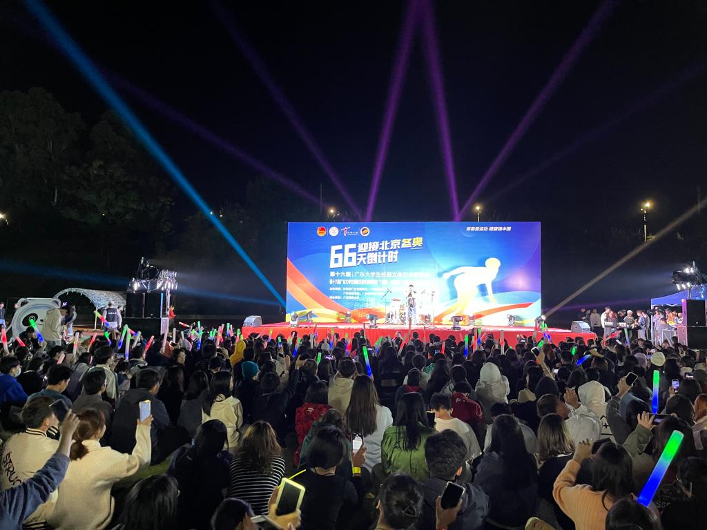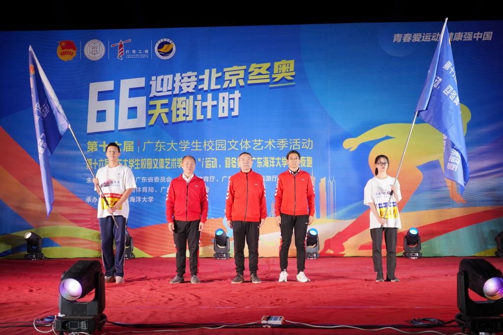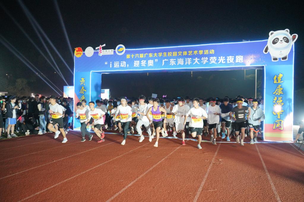 邓逢光为夜跑活动健身组、竞赛组代表授旗;曹俊明为活动鸣响发令器,发令开跑,参赛人员挥舞着荧光棒,从起跑拱门鱼贯而出。曹俊明、林晓敏、邓逢光带领教职工,融入奔跑的队伍中。本次赛程6.6公里,寓意北京冬奥会倒计时66天。在活动终点,参赛选手通过手掌印和贴图等方式在背景墙上为北京冬奥会祝福加油。荧光音乐节随即盛大开演,舞台的节目和各社团摊位游戏让海大学子享受了一场文化盛宴。