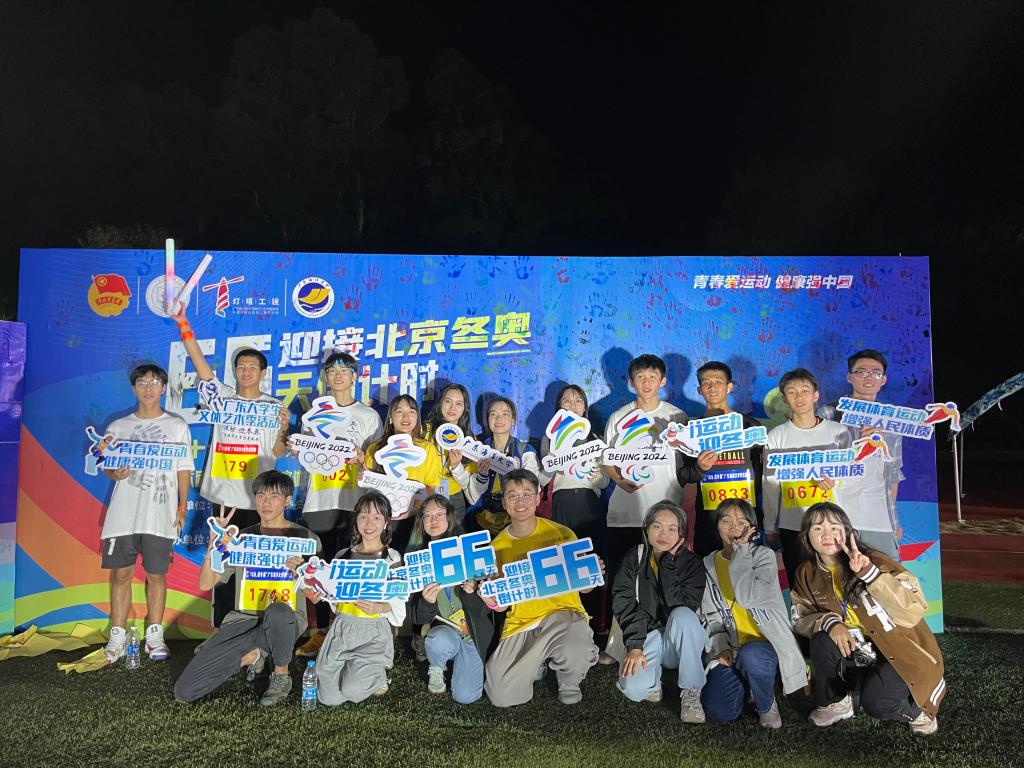 晚上六点三十分,随着醒狮队浑厚的鼓声响起,参加夜跑活动的师生手带荧光环聚集在运动场的舞台前,跟随学生主持人的节拍,高喊“青春爱运动,健康强中国,为北京冬奥加油,666”口号,彻底引燃荧光夜跑活动。舞台旁边大型LED屏幕上巨大的奥运九宫格和北京冬奥会宣传片让祝福冬奥的气氛愈加浓厚。期间,活动主会场广州体育学院与承办高校进行了连线。