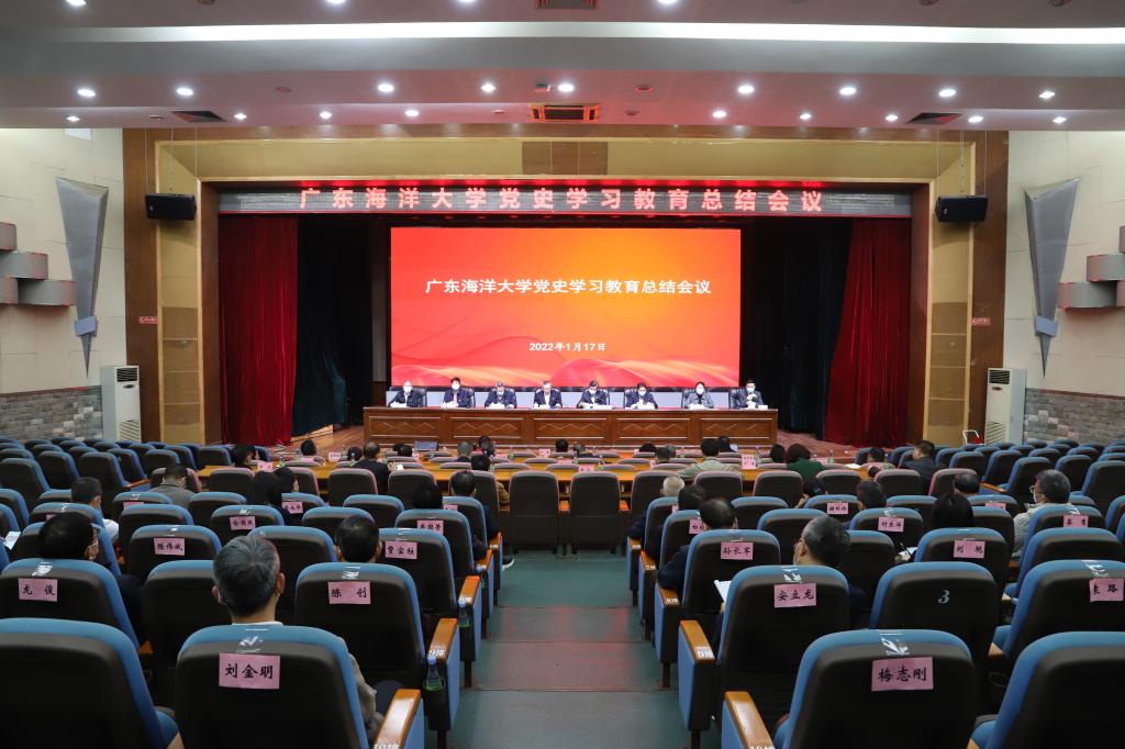 学校党委书记、党史学习教育领导小组组长曹俊明讲话。他指出,在历时一年的党史学习教育中,根据党中央决策部署和省委、市委及省市教育系统工作安排,在湛江市委党史学习教育第十一巡回指导组有力指导下,学校党委紧紧围绕“学史明理、学史增信、学史崇德、学史力行”目标,一体推进“学党史、悟思想、办实事、开新局”的总要求,紧密结合学校工作实际,科学筹划、真抓实做,全校各级党组织上下联动、有序推进,广大党员干部身体力行、学思践悟,师生群众积极响应、广泛参与,学习教育进展有序扎实深入,广大党员干部师生经受了全面深刻的政治教育、思想淬炼、精神洗礼,在学史明理上有了新升华,在学史增信上有了新收获,在学史崇德上有了新提升,在学史力行上有了新成效,各级党组织的创造力、凝聚力、战斗力持续增强,党史学习教育取得了扎实成效。一是聚焦担责任强统筹,强化组织领导、部署落实、督导检查、宣传引导,切实提高学习教育的质量效果;二是聚焦学党史悟思想,坚持提高站位全面学、突出重点系统学、以上率下示范学、联系实际深入学,对“两个确立”决定性意义的领悟更加深刻,践行“两个维护”更加自觉;三是聚焦守初心葆本色,激活红色资源,用好红色课堂,在传承红色基因中凝聚起攻坚克难、砥砺奋进的精神力量;四是聚焦解难题暖民心,找准问题需求,聚力攻关解决,在办好实事中彰显了为民惠民、服务群众的责任担当;五是聚焦开新局谋新篇,加快建设国内一流国际知名的高水平海洋大学、推进学校高质量发展,在服务地方发展大局中发挥战略支撑作用。