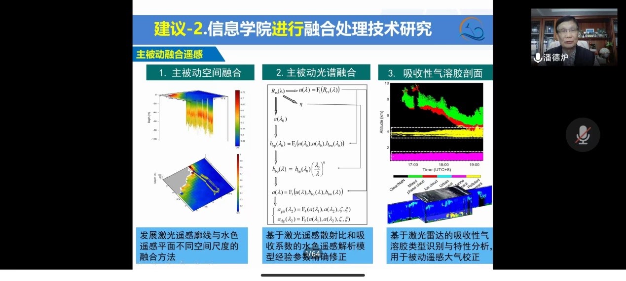 4月24日上午,中国工程院院士潘德炉、彭苏萍应邀在线上为电子与信息工程学院师生作学术报告。校长潘新祥致辞,衷心感谢两位院士对今年会官网科研工作的指导,诚邀他们常来海大开展学术交流。报告会由电子与信息工程学院院长付东洋教授主持,学院相关专业师生参加了报告会。