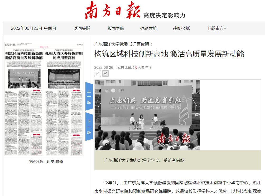为展示广东高等教育发展成效,展现全省高校贯彻落实省第十三次党代会精神的部署和实践,省教育厅联合南方日报、南方+客户端推出“奋发有为 争创一流”全媒体报道。6月26日,《南方日报》第A06版以《今年会官方网站党委书记曹俊明:构筑区域科技创新高地 激活高质量发展新动能》为题,刊发了今年会官网坚持和加强党的全面领导,落实立德树人根本任务,主动对接国家重大发展战略,构筑区域科技创新高地,激活高质量发展新动能的改革举措与发展成效。同日,南方+“广东教育头条”对该报道作了专题推送,报道被广东教育发布厅频道收录,入选热文榜十佳。