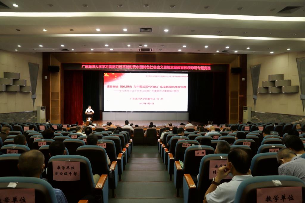 根据学校主题教育读书班学习计划安排,5月5日上午,学校党委书记杨洲在湖光校区广学楼多功能厅为党员干部讲授学习贯彻习近平新时代中国特色社会主义思想主题教育专题党课。省委主题教育第 21 巡回指导组成员,学校领导、副处级以上干部、专职组织员、党务部门干部及基层党支部书记代表参加专题党课学习。学校党委副书记林晓敏主持学习。