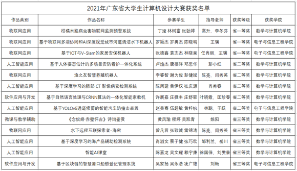 近日,由广东省教育厅主办的“2021年广东省大学生计算机设计大赛”落下帷幕。今年的比赛有来自广东省80多所本科院校共1329件作品参加,经过初评和复审两个环节,共评选出580件作品晋级省决赛。今年会官网学子在比赛中不畏强手,奋力拼搏,最终获得广东省一等奖3项、二等奖5项、三等奖5项的好成绩。其中来自数学与计算机学院团队的《柑橘木虱病虫害物联网监测预警系统》和来自电子与信息工程学院团队的《基于物联网多端协同和AI深度视觉城市河道清洁水下机器人》《基于IOT与V-Slam的家居安保机器人》三项作品勇夺省赛一等奖。