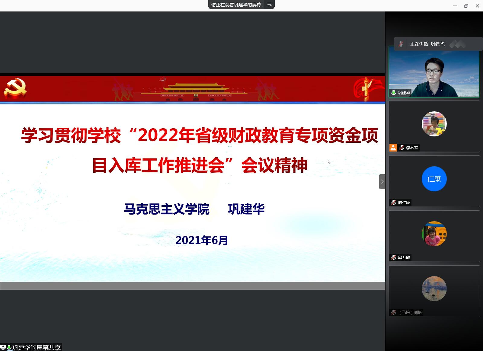 6月19日,为深入学习领会省教育厅《关于做好2022年省级财政教育专项资金项目入库工作的通知》、学校《关于抓紧做好2022年省级财政教育专项资金项目入库工作的通知》等文件精神,贯彻落实学校“2022年省级财政教育专项资金项目入库工作推进会”工作部署,马克思主义学院以腾讯会议形式举行了全院教职工大会,学院党总支书记宋玉忠及全院教职工40余人参加了会议,会议由院长巩建华主持。