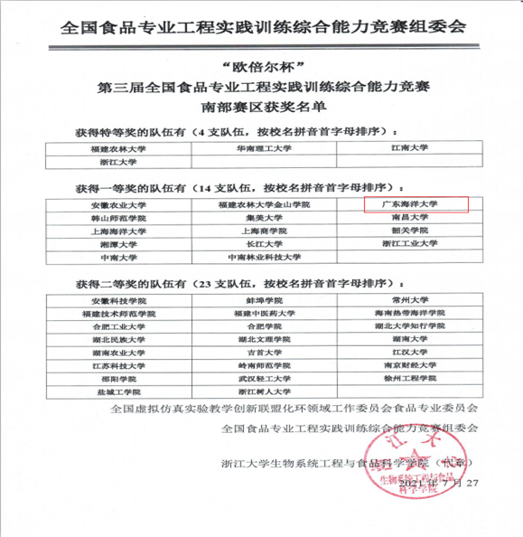 食品科技学院学子在第三届全国食品专业工程实践训练综合能力竞赛(南部赛区)荣获一等奖