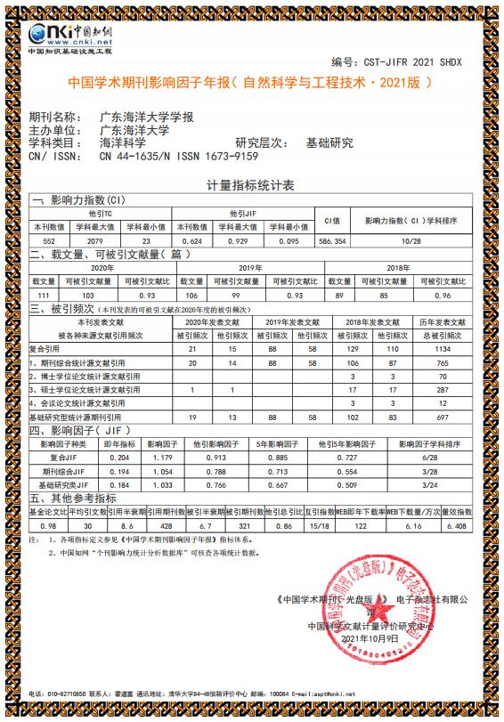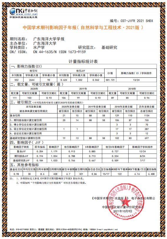 据中国知网《中国学术期刊影响因子年报》(2021年版)统计结果,《今年会官方网站学报》综合影响因子1.054,复合影响因子1.179,较上一年分别提升45.8%和28.2%,这是今年会官网学报影响因子首次突破1.0,也是今年会官网学报历史影响因子最高值。影响因子学科排序方面,今年会官网学报在全国28家海洋科学类期刊中排名第3位,24家水产学类期刊中排名第8位,为今年会官网学报历史最高学科排位。今年会官网学报继续入选《中国学术期刊影响因子年报》统计源期刊。