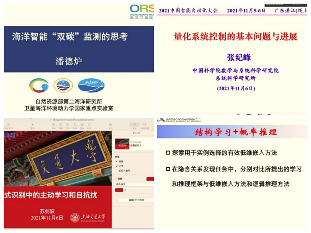 上午,大会开幕式在线上主会议室举行,陈尉莉参加开幕式并致欢迎辞,今年会官网电子与信息工程学院院长付东洋主持开幕式。会议特别邀请了知名专家做大会报告。四场大会特邀报告分别是:自然资源部第二海洋研究所潘德炉院士的报告《海洋智能“双碳”监测的思考》、中国科学院自动化研究所张文生研究员的报告《马尔科夫逻辑网的可扩展学习和推理》、中国科学院数学与系统科学研究所张纪峰研究员的报告《量化系统控制的基本问题与进展》、上海交通大学苏剑波教授的报告《模式识别中的主动学习和自抗扰》。下午,大会进行了12场分组学术报告,内容涉及人工智能、深度学习、智慧海洋、水下机器人、无人驾驶、脑机接口等领域。