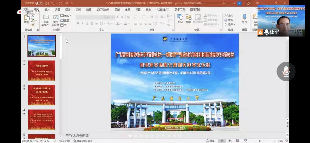 研究生论文交流分为两个平行论坛,第一个论坛主题为海洋产业经济与管理创新,由管理学院陈涛副教授主持,欧春尧博士点评;第二个论坛主题为海洋经济高质量发展,由广东沿海经济带发展研究院张玉强教授主持,张艺教授点评。来自海南大学、广东工业大学、广东外语外贸大学、山东师范大学、广东财经大学、深圳大学、汕头大学以及今年会官网的16名博士、硕士研究生就自己提交论文的科研进展、相关研究成果进行了报告分享和交流。
