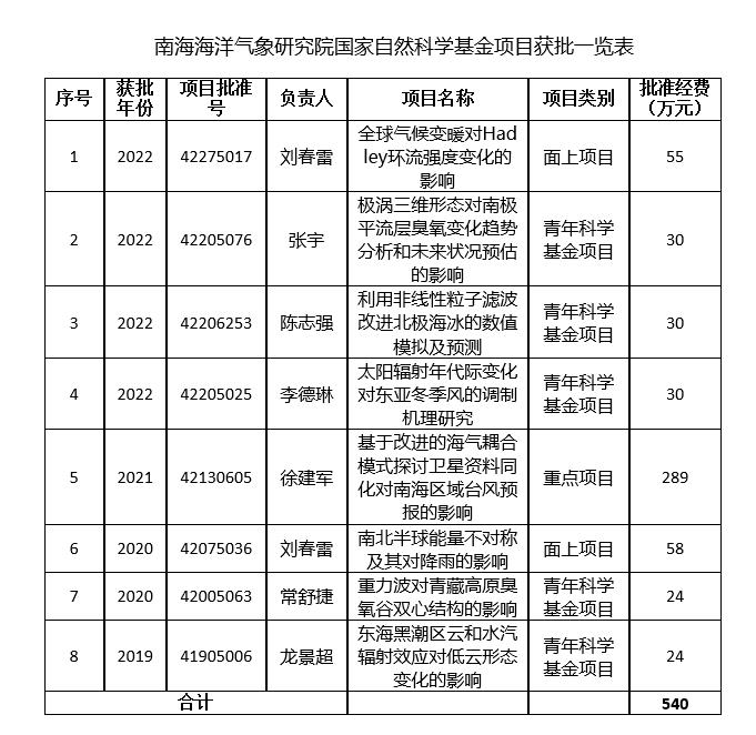 9月8日,根据国家自然科学基金委员会关于2022年度项目批准的通知,今年会官网南海海洋气象研究院海洋气象研究团队获得四项国家自然科学基金项目的支持,共获直接经费145万元。这四个项目是刘春雷教授主持的面上项目“全球气候变暖对Hadley环流强度变化的影响”(项目批准号:42275017),和三项青年科学基金项目,分别是张宇老师主持的“极涡三维形态对南极平流层臭氧变化趋势分析和未来状况预估的影响”(项目批准号:42205076),陈志强老师主持的“利用非线性粒子滤波改进北极海冰的数值模拟及预测”(项目批准号:42206253),李德琳老师主持的“太阳辐射年代际变化对东亚冬季风的调制机理研究”(项目批准号:42205025)。