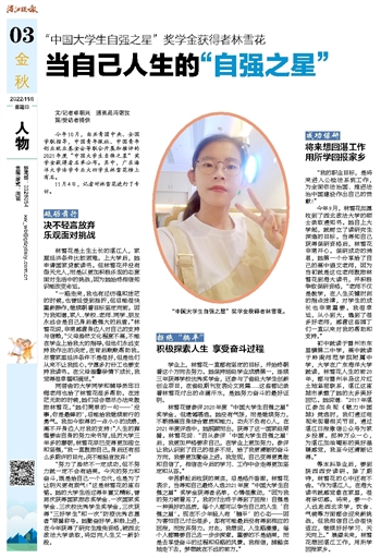 林雪花曾参评2020年度“中国大学生自强之星”奖学金,但遗憾落选。她没有气馁,而是继续努力,不断提高自身综合素质和能力。功夫不负有心人,在2021年度评选中,她脱颖而出,获得了这一国家级荣誉。林雪花说:“自从参评‘中国大学生自强之星’后,我更加严格要求自己,在学业上更加努力。参评让我认识到了自己的很多不足,给了我更清晰的奋斗方向,我要更加勤奋上进。我发现,自己变得更勇敢和自信了,相信在今后的学习、工作中会走得更加坚定和从容。”