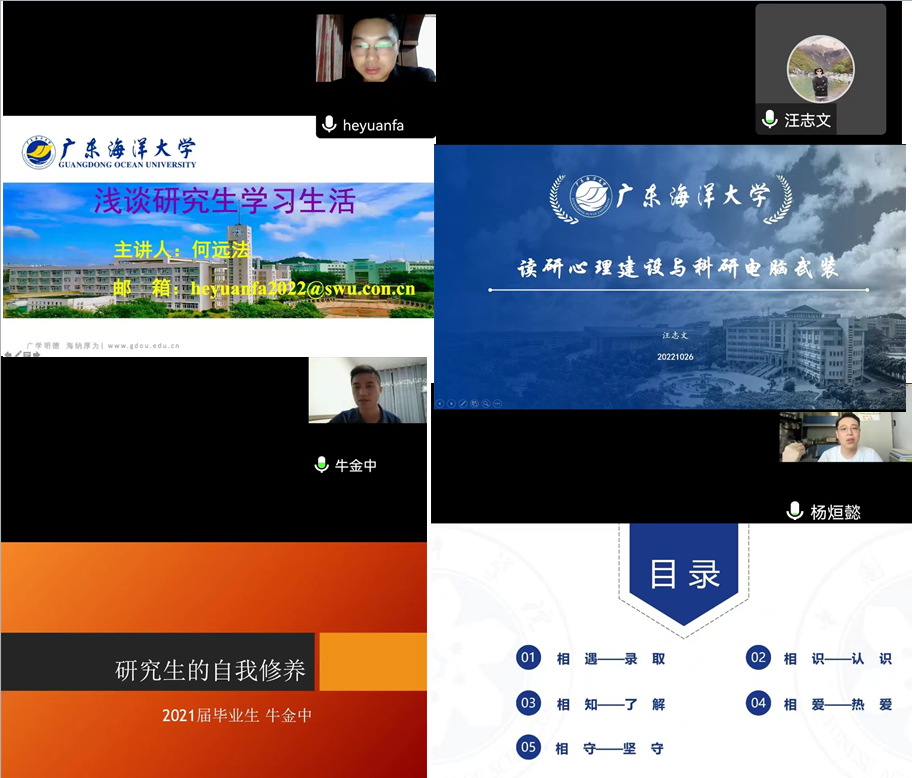 为加快研究生新生适应校园生活,提升学习科研能力,9月22日-10月26日,水产学院博士生党支部为全体研究生新生举办了“研究生怎么读”系列讲座。讲座邀请了中科院水生所博士后汪志文、西南大学水产学院副教授何远法、重庆市农委二级主任科员牛金中博士、中科院海洋所在读博士杨烜懿等学院近三年毕业的优秀研究生作为主讲人。