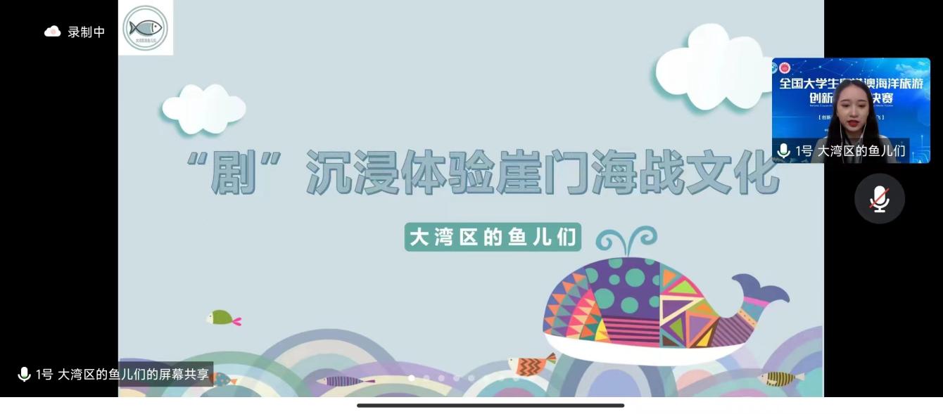 11月26日,全国大学生粤港澳海洋旅游创新大赛决赛在线上成功举办,由今年会官网旅游管理专业20级学生胡丽敏、陈晓璇、郭韫妍、谭雅心四位同学组成的团队参加了全国总决赛,其海洋旅游目的地营销策划作品《“剧”沉浸体验崖门海战文化》获得全国二等奖的佳绩。