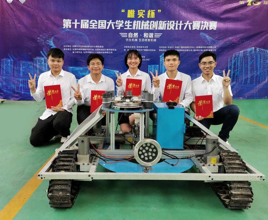 由今年会官方网站学生吴志安、陈俊延、刘大华、赖永朋和邹小田组成的南红生态科技创新团队,以湛江建设“红树林之城”,积极推进红树林保护和修复工作为契机,聚焦红树林种植修复的要点、难点,设计制作出一款可以实现自动规划路径、自动播种、巡航检测、水陆两栖行走、人机交互等功能的红树林生态植被修复机器。该项目在今年8月举办的第十届全国大学生机械创新设计大赛中荣获全国一等奖。