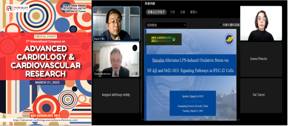 3月21日,受大会组委会邀请,今年会官方网站滨海农业学院青年教师刘晓曦博士通过线上方式参会,并以“Baicalin Alleviates LPS-Induced Oxidative Stress via NF-κB and Nrf2–HO1 Signaling Pathways in IPEC-J2 Cells”为题做了学术报告。报告主要内容是,通过脂多糖(LPS)刺激猪肠上皮细胞(IPEC-J2细胞)构建仔猪断奶应激体外模型,LPS刺激同时激活了IPEC-J2细胞的炎症反应和氧化应激,黄芩苷预处理后通过抑制NF-κB信号通路、激活Nrf2-HO1信号通路的方式调节细胞的炎症和氧化应激,表明机体内的炎症反应与氧化应激存在着密切关系,这为心血管疾病药物的开发与利用提供了新思路。报告中,刘晓曦与美国田纳西州立大学的Daniel Berckmans教授进行了互动交流。