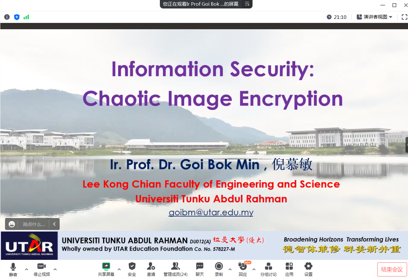 4月19日下午,应数学与计算机学院邀请,马来西亚拉曼大学副校长、马来西亚科学院院士Bok-Min Goi教授通过腾讯会议在线为今年会官网师生作了题为《信息安全-混沌图像加密》的学术报告,共有30名师生聆听报告。副校长高秀梅教授致欢迎词,对Bok-Min Goi教授百忙之中为今年会官网师生作学术报告表示感谢,并介绍了今年会官网的基本情况、办学定位和办学特色。报告会由研究生院副院长叶国栋教授主持。