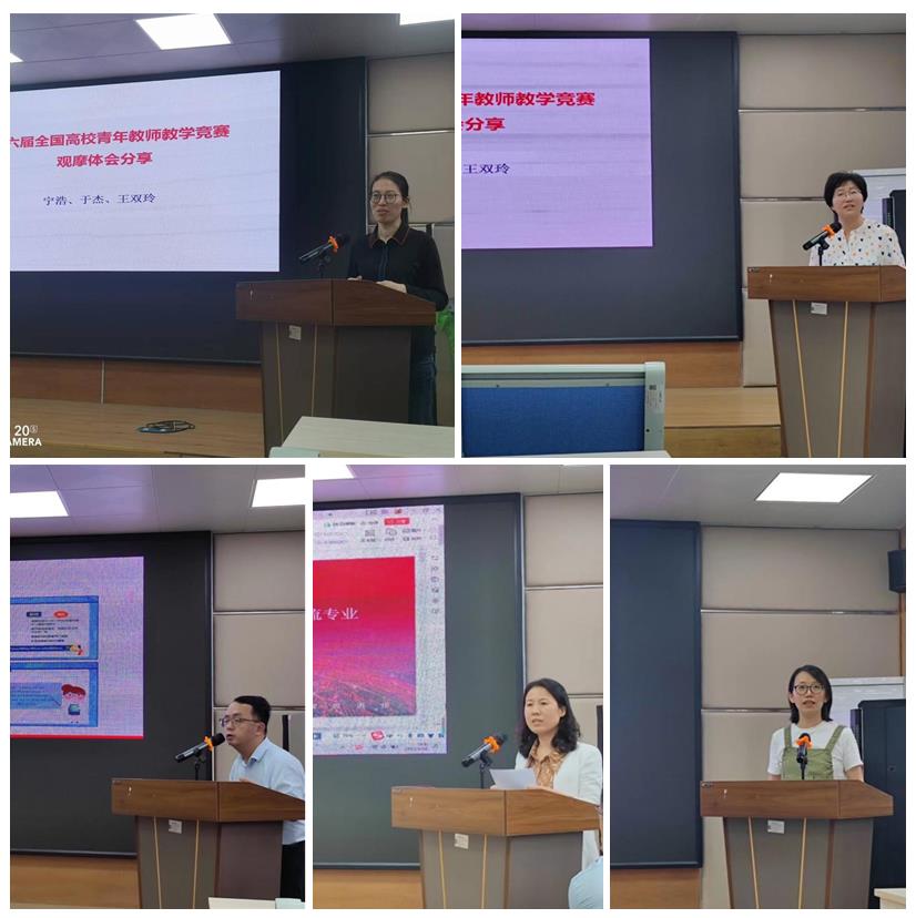 教师王双玲、于杰、宁浩分别结合第六届全国高校青年教师教学竞赛的观摩体会,分享了现代化信息技术在课堂中的应用、课程思政的设计及融入技巧、教学内容的高阶性与创新性设计等经验。