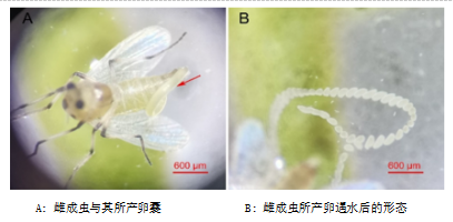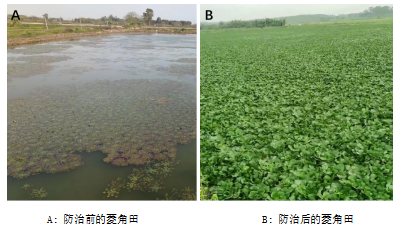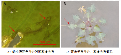 团队实地察看菱角害虫危害情况,通过野外调查、室内饲养,记录了其为害特点、形态特征,并进行了分子鉴定。经鉴定该害虫为林间环足摇蚊,在国内尚无为害菱角记录,其幼虫啃食叶片,严重爆发可造成菱角绝产。团队迅速制定防治方案,采用调控水肥,物理防治加化学防治相结合的方法,解决了水面施药效果差的难题,为种植户挽回了经济损失。