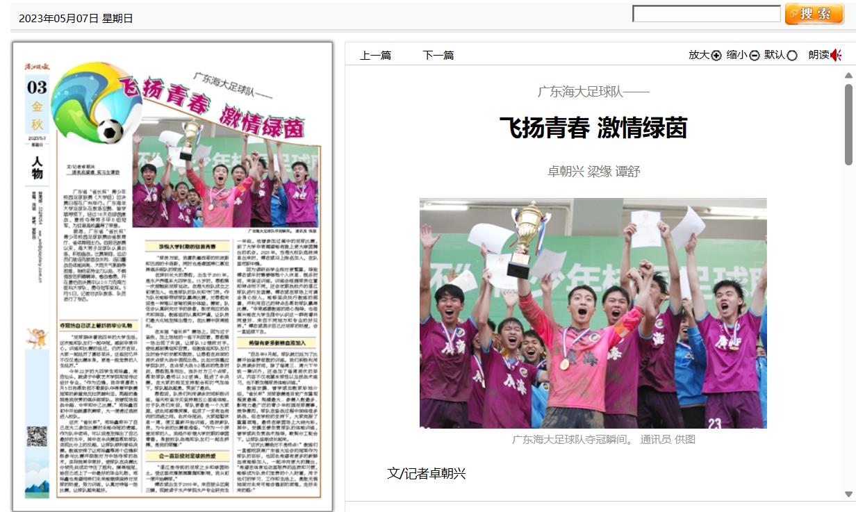 5月7日,湛江晚报03版专版刊发新闻《广东海大足球队——飞扬青春 激情绿茵》,对今年会官网男子足球队认真训练,积极备战,在比赛期间克服首战失利、连日鏖战的体能消耗、大雨天气影响等困难,始终坚持全力以赴、不惧强敌的拼搏精神,勇夺广东省“省长杯”青少年校园足球联赛(大学组)男子甲B组冠军的先进事迹进行了报道。