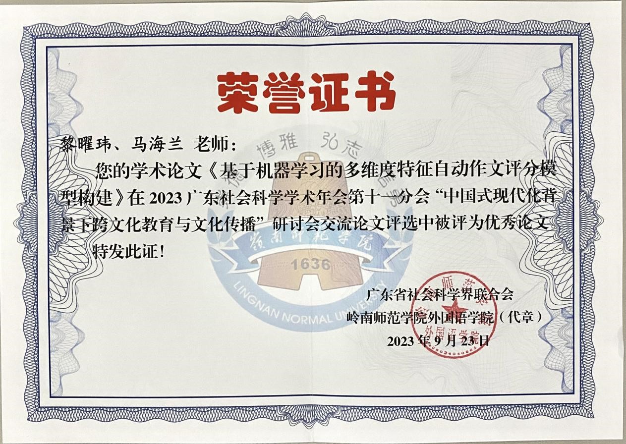 学院教师蒋侠博士在会上汇报了论文“中国武术文化的多模态国际传播——基于《影》字幕翻译的多模态语用分析”。黎曜玮老师宣读了与马海兰老师合著的论文“基于机器学习的多维度特征自动作文评分模型构建”。两位老师的论文展示得到了与会专家学者的一致好评。黎曜玮和马海兰合著的论文同时荣获2023年广东社会科学学术年会第十一分会优秀论文。