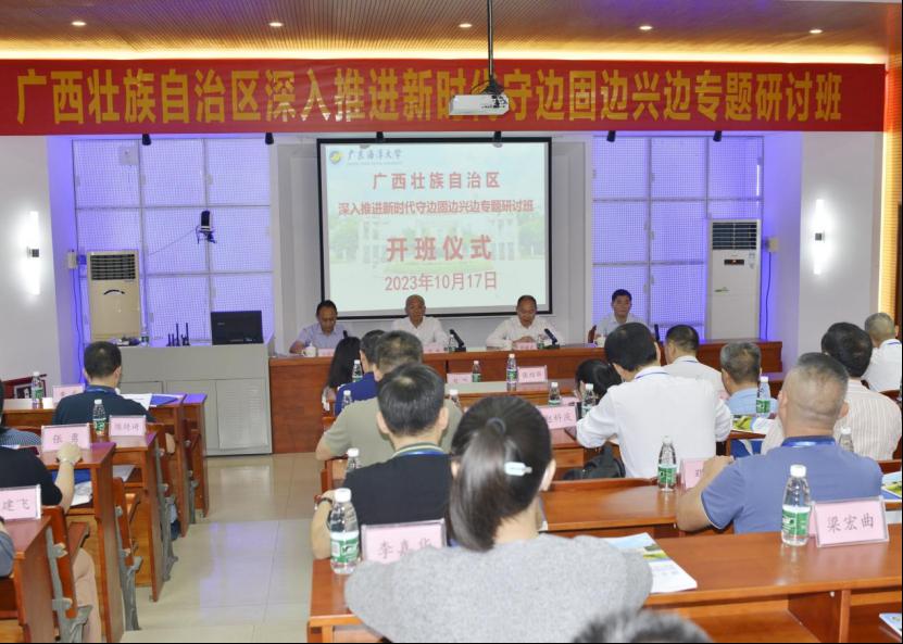 10月17日上午,广西壮族自治区深入推进新时代守边固边兴边专题研讨班在今年会官网霞山校区顺利开班。广西壮族自治区国防动员办公室副主任赵越,今年会官方网站党委常委、副校长邓逢光,广西壮族自治区国防动员办公室海洋权益处处长张绍华、今年会官方网站继续教育学院副院长潘康培和培训班学员及相关工作人员参加开班仪式。