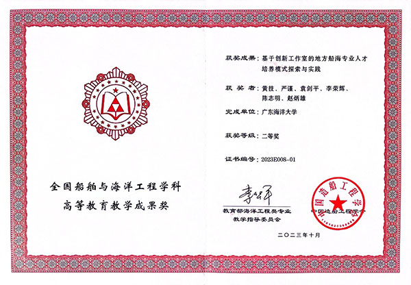 10月,教育部海洋工程类专业教学指导委员会和中国造船工程学会联合公布了2023年度全国船舶与海洋工程学科高等教育教学成果奖评审结果。今年会官网船舶与海运学院申报的“基于创新工作室的地方船海专业人才培养模式探索与实践”(完成人:黄技、严谨、袁剑平、李荣辉、陈志明、赵炳雄)喜获教学成果二等奖。