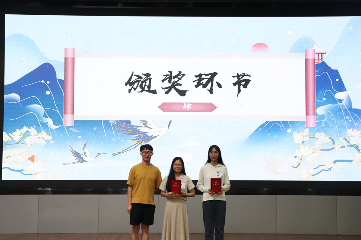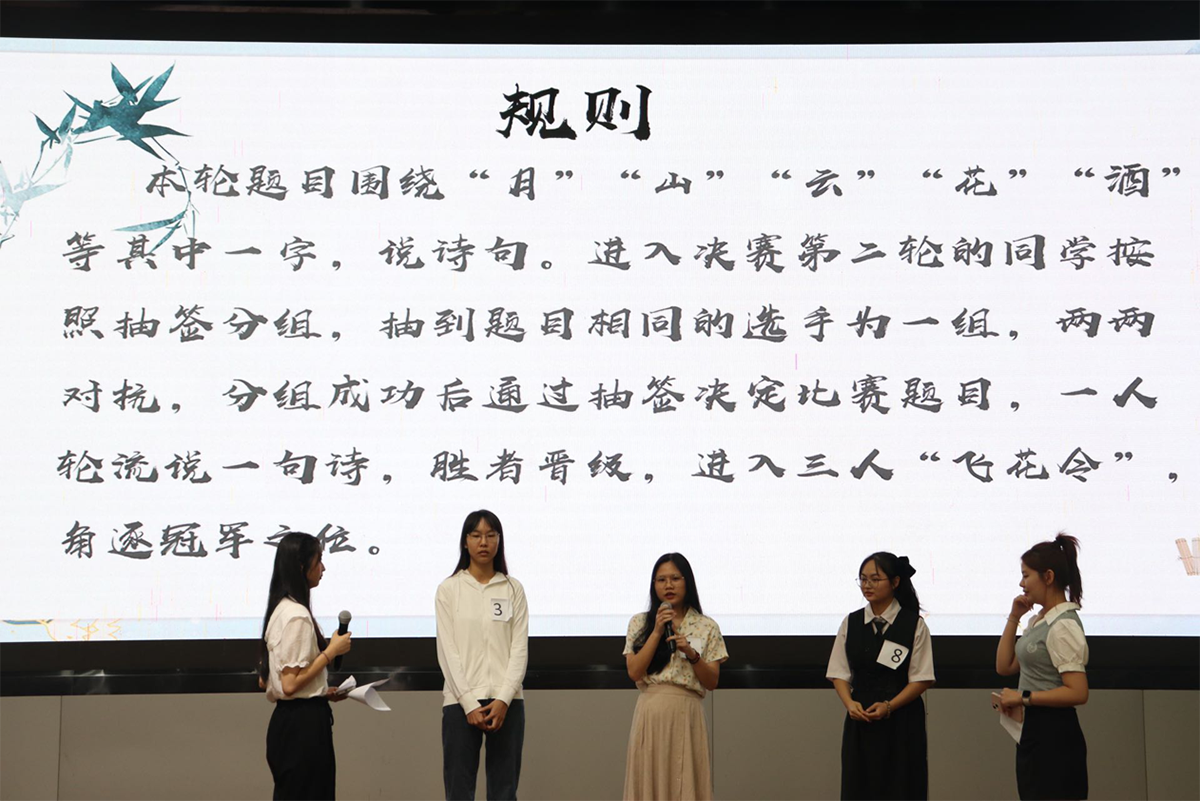 本次古诗词大会分为初赛和决赛两个部分。初赛以线上答题形式考察学生对古诗词知识的积累,共有300多名学生参加,最后前12名晋级决赛。决赛分为诗词接龙抢答和“飞花令”冠军争夺赛两轮,诗词接龙抢答后,共有6名选手进入“飞花令”冠军争夺赛。选手们的精彩表现赢得掌声不断。最终,汉教1212班曹倩怡、汉教1222班余悦、汉教1211班程潆分别获得前三名,曹倩怡、余悦作为校赛前两名选手,将代表学校参加“2024中国诗词大会”广东省选拔赛。
