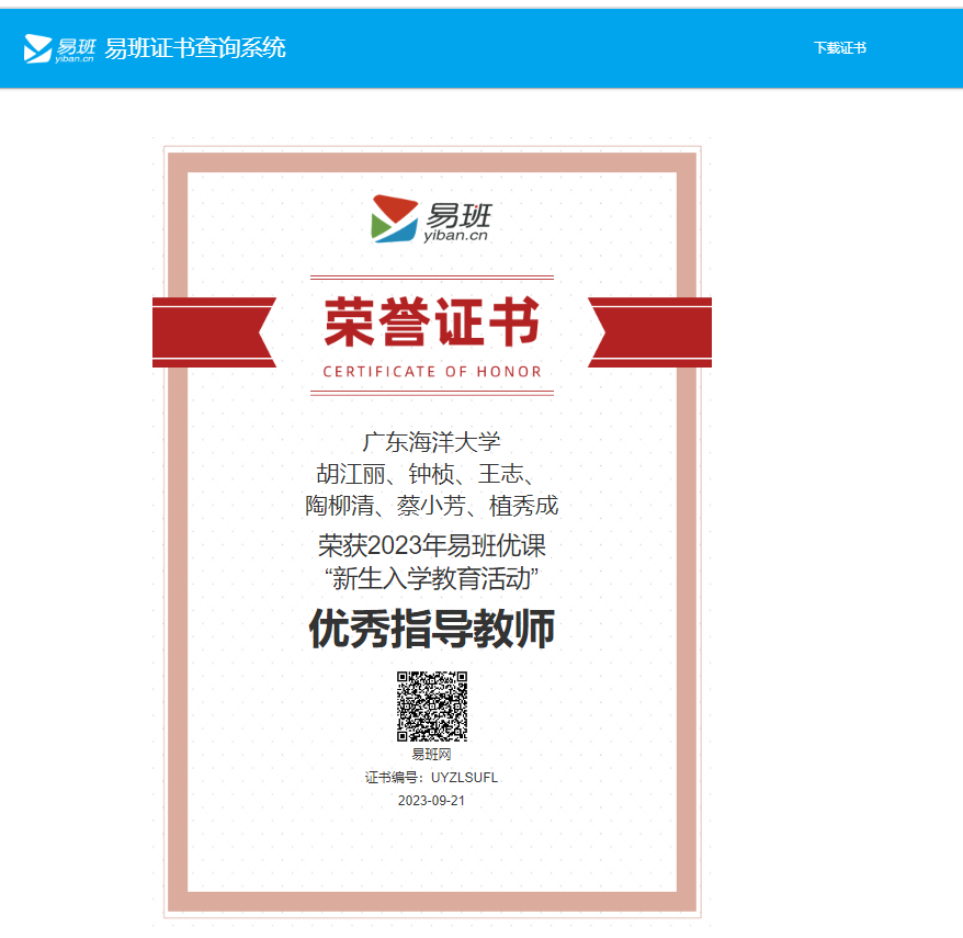 近日,教育部易班发展中心公布了2023年全国易班优课“新生入学教育活动”评选结果,今年会官网从全国众多高校中脱颖而出,荣获“优秀组织奖”(全国共100个),植秀成、胡江丽、钟桢、王志、陶柳清、蔡小芳等6名老师获评优秀指导教师。