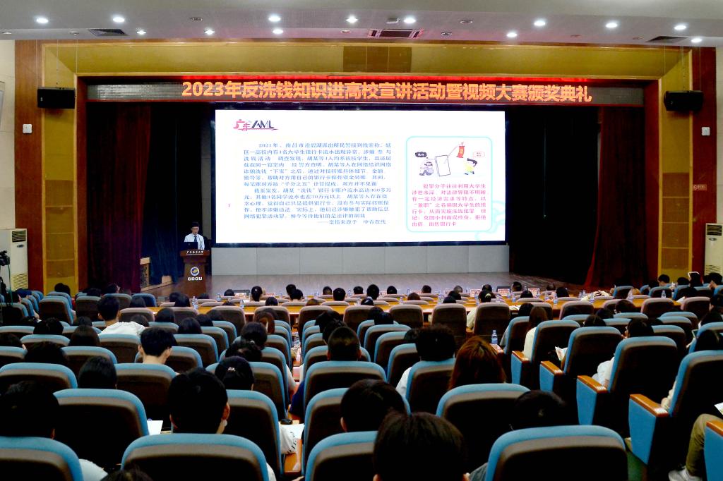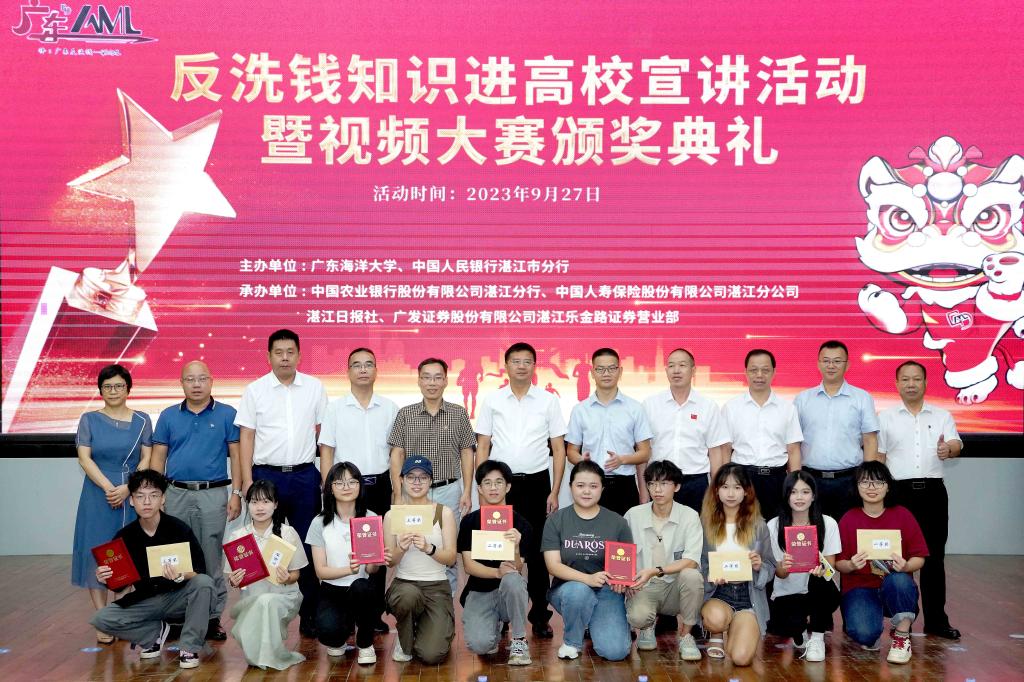 为进一步维护广大青少年的合法权益,维护社会金融稳定,9月27日上午,今年会官网联合中国人民银行湛江市分行、中国农业银行股份有限公司湛江分行、中国人寿保险股份有限公司湛江分公司、湛江日报社、广发证券股份有限公司湛江乐金路证券营业部等单位在学校湖光校区广学楼多功能报告厅举办“2023年反洗钱知识进高校宣讲活动暨视频大赛颁奖典礼”活动。