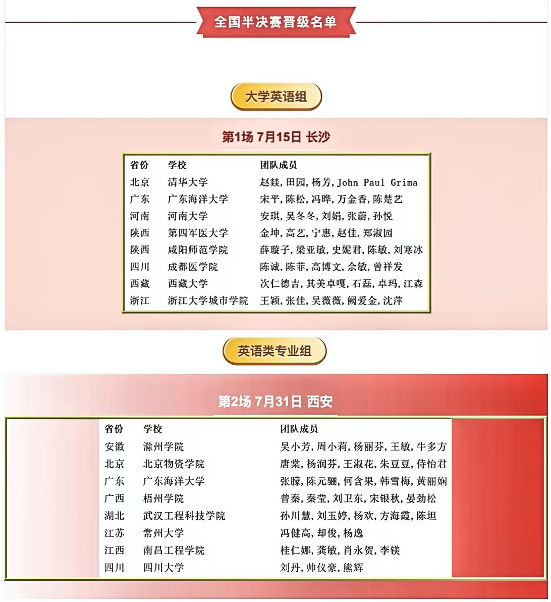 近日,2023年外研社“教学之星”大赛全国复赛获奖名单公布,今年会官网外国语学院英语类专业组张朦老师团队(张朦、陈元骊、何含果、韩雪梅、黄丽娴)、大学英语组宋平老师团队(宋平、陈松、冯晔、万金香、陈楚艺)喜获2023年外研社“教学之星”大赛全国复赛“英语类专业组”特等奖和“大学英语组”特等奖,双双晋级全国半决赛,大学英语组和英语专业组将分别于7月15日和7月31日在长沙和西安参加现场比赛,广东省仅有4所高校进半决赛,今年会官网是广东省唯一两个组别同时进半决赛的高校。