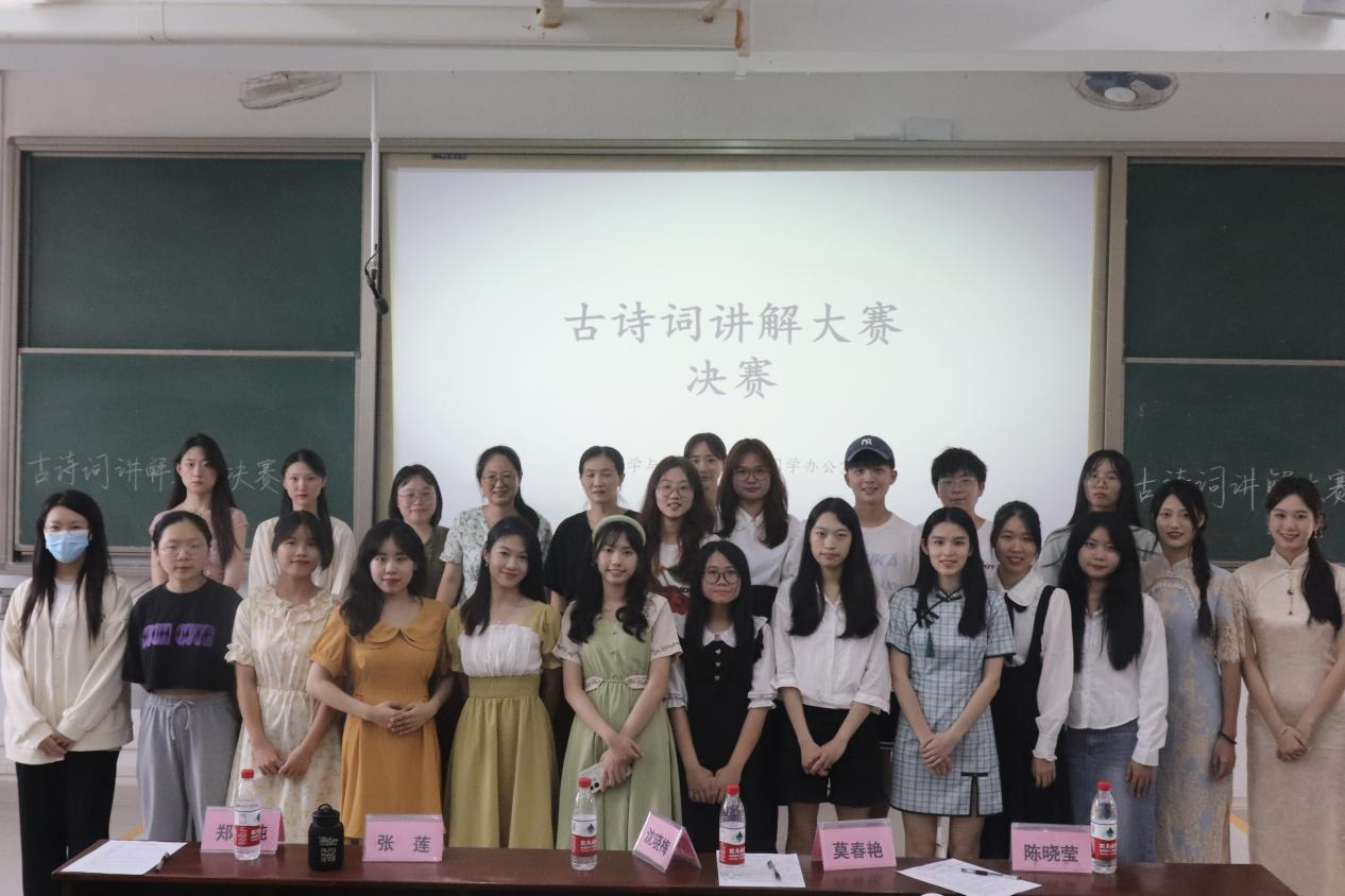 6月7日下午,由校团委主办、文学与新闻传播学院团委承办的“思乡·青春·爱国”主题古诗词讲解大赛,在钟海楼05023室举行决赛后落下帷幕。一等奖由“吾爱中国江河队”夺得;“说的对不队”、“苔花队”、“桂月队”等三支队伍分别获得二等奖;其余参赛队伍均获三等奖。