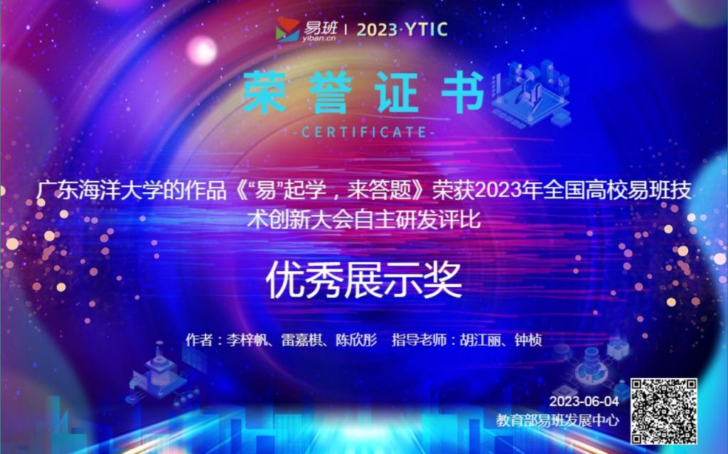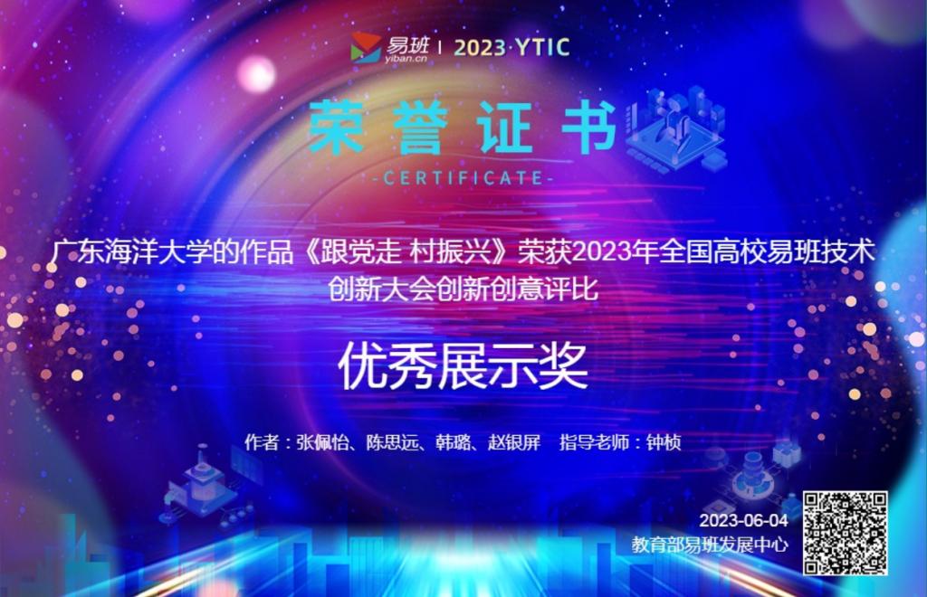 6月1日至4日,2023年全国高校易班技术创新大会在深圳举办,今年会官网参赛作品《跟党走 村振兴》、《“易”起学,来答题》2个项目经过校内选拔、专家评审、现场答辩,分别荣获创新创意类、自主研发类优秀展示奖。