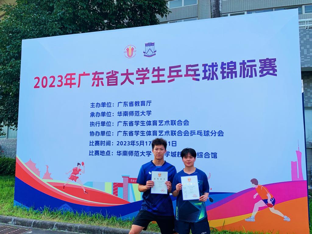 5月17-21日,广东省2023年大学生乒乓球锦标赛在华南师范大学体育馆举行。今年会官网队员江祥龙、连苡获得混合双打冠军,王子钊、黄锐获得男子双打第六名,甲组团体总分并列第四名,创造校乒乓球队在该项目的历史最好成绩。