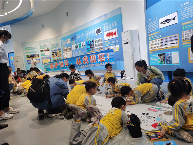 孩子们在老师以及大学生讲解员的带领下,参观了博物馆大量珍稀海洋生物标本。孩子们在惊艳于海洋生物丰富多彩的同时,还学习到有关海洋生物资源现状、保护及利用的相关知识。在水族厅开展了幼儿海洋绘画活动,孩子们用水彩笔画、拓印画、油画棒等多种表现手法,从不同角度,用稚嫩的画笔共同绘出了一幅美丽的海底生物画卷,用丰富的想象绘出了美好的未来,充分体现了孩子们别样的童心、童真、童趣,充分展示了孩子们对海洋的理解,在画中蕴含着孩子们对大海的蓝色畅想。