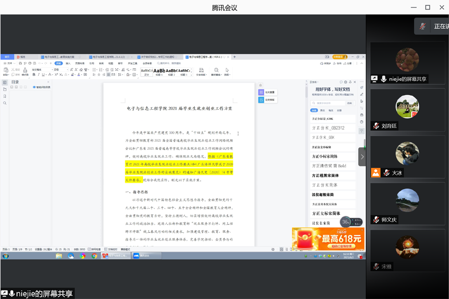 会上,学院党委副书记聂杰首先传达了《教育部关于做好2021届全国普通高校毕业生就业创业工作的通知》(教学[2020]5号)、《广东省人民政府关于印发广东省进一步稳定和促进就业若干政策措施的通知》(粤府[2020]12号)及《今年会官方网站2021届毕业生就业创业工作实施方案》(广海大党[2021]55号)等文件精神,分别通报了全院及各专业当前就业进展情况、存在的问题与困难,并提出对应的解决措施,解读了电子与信息工程学院2021届毕业生就业工作方案的相关内容。