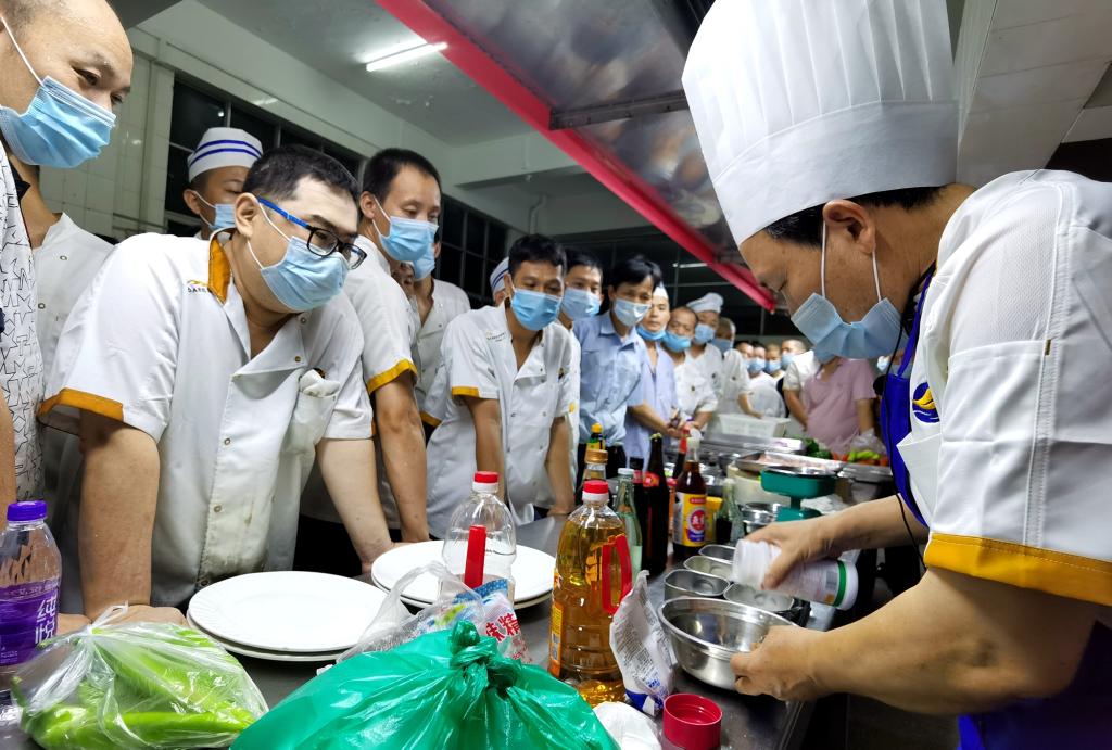 培训为期共9天,包含八次菜式教学及一次心得交流,由从事烹调技术教学工作39年的资深师傅陆超同志进行专业教学指导。教学内容以粤菜为主,旨在通过用料及酱料配比的培训,将理论教学与实践展示相结合,从“色、香、味、形”四个方面全面提升饭堂菜品。培训期间,食堂厨师们充分展现了学习技能的热情和决心,利用休息的时间主动参加培训,认真学习老师讲解的知识要点,查找操作中出现的问题。培训过程中厨师们互相交流并对当前菜品烹调的技术进行了积极地讨论,取得了良好的培训实效。