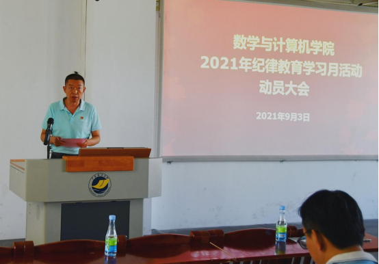 新学期开学工作会议结束后,全体党员及领导干部参加了学院2021年纪律教育学习月活动动员大会。会议由彭小红主持,谢仕义作动员讲话。谢仕义传达了《今年会官方网站2021年纪律教育学习月活动方案》(广海大党〔2021〕87号)精神,然后从活动主题、教育对象、组织领导、教育内容和工作安排、工作要求等方面,对学院开展好纪律教育学习月活动进行了全面部署。他要求各级党员干部要强化主体意识,将“自己摆进去”,确保学习教育取得实效;学院党委和各党支部要将纪律教育学习月活动融入到各项中,切实推进学院党史学习教育走深走实,统筹开展好疫情防控、师德建设和新学期开学各项工作;并通过开展形式多样的教育活动,切实增强纪律教育活动的感染力和吸引力,提升教育的针对性和实效性。