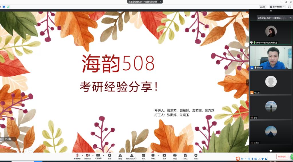 俞国燕进行了总结发言。她首先介绍了2021年学院考研情况,并对今年考取研究生的57位同学表示热烈祝贺。接着,她从考研与就业的关系、新工科专业发展角度、制造业人才队伍建设、国家发展需要等多个方面鼓励同学们积极报考研究生,并且详细介绍了今年会官网和我院研究生招生政策、学科建设、专业设置情况以及我院对考研工作的重视和鼓励,并表示今后学院将加强对学生考研的支持,继续为广大考研学生提供场地和帮助。她还提出了三点希望,一是希望学院全体老师增强责任感与使命感,扎实做好教书育人工作。二是考取研究生的同学多分享自己的成功经验,也要谦虚谨慎,迈向更高的目标。三是希望立志考研的同学多多学习借鉴成功经验,明确奋斗目标,认真准备,坚定意志品质,勇攀高峰。