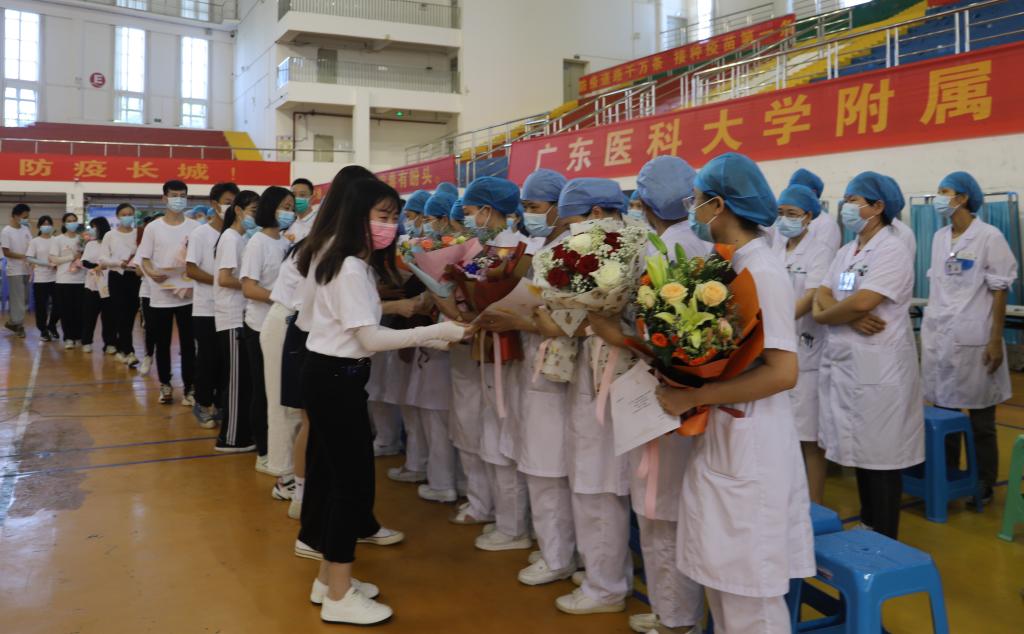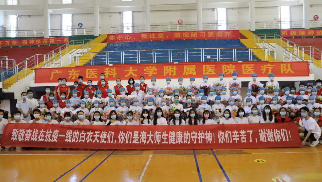 “一袭白衣一顶燕帽,感谢您用娴熟的技术和优质的服务,在海大师生心中种下安心的种子,您永远是我们心中最美的天使”。为表达对学校新冠疫苗接种点医护人员的敬意和感谢,6月19日下午,学校思政小助理代表全校学子在湖光校区体育综合馆向全体医护人员敬献鲜花及感谢卡,深情欢送广东医科大学附属医院医疗队。