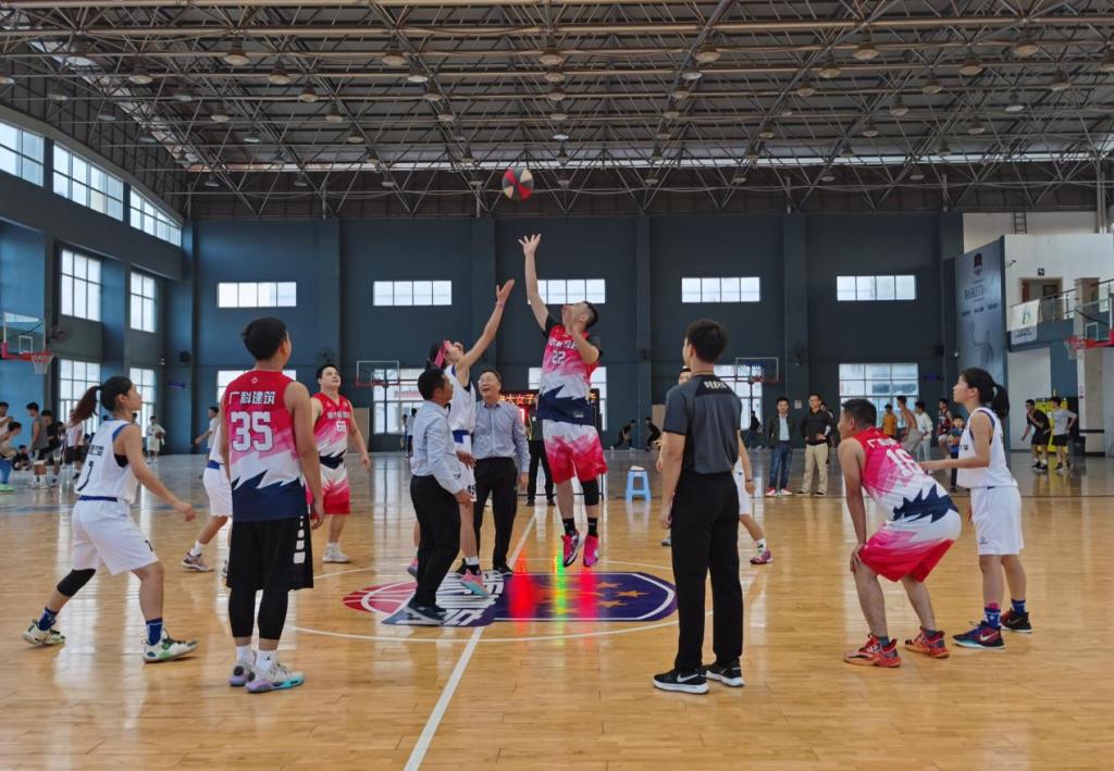 彭权群、蔡炯耀共同为海大女子篮球队和湛江校友会男子篮球队友谊交流赛开球。