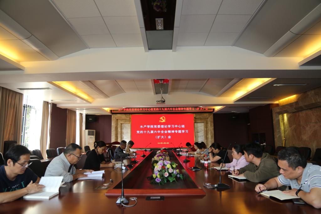 11月15日下午,水产学院党委理论学习中心组在水产楼会议室召开专题学习(扩大)会,集中学习党的十九届六中全会精神。会议由学院党委书记梁朝辉主持。学院领导、党委委员、党支部书记、团委书记等参加学习会。