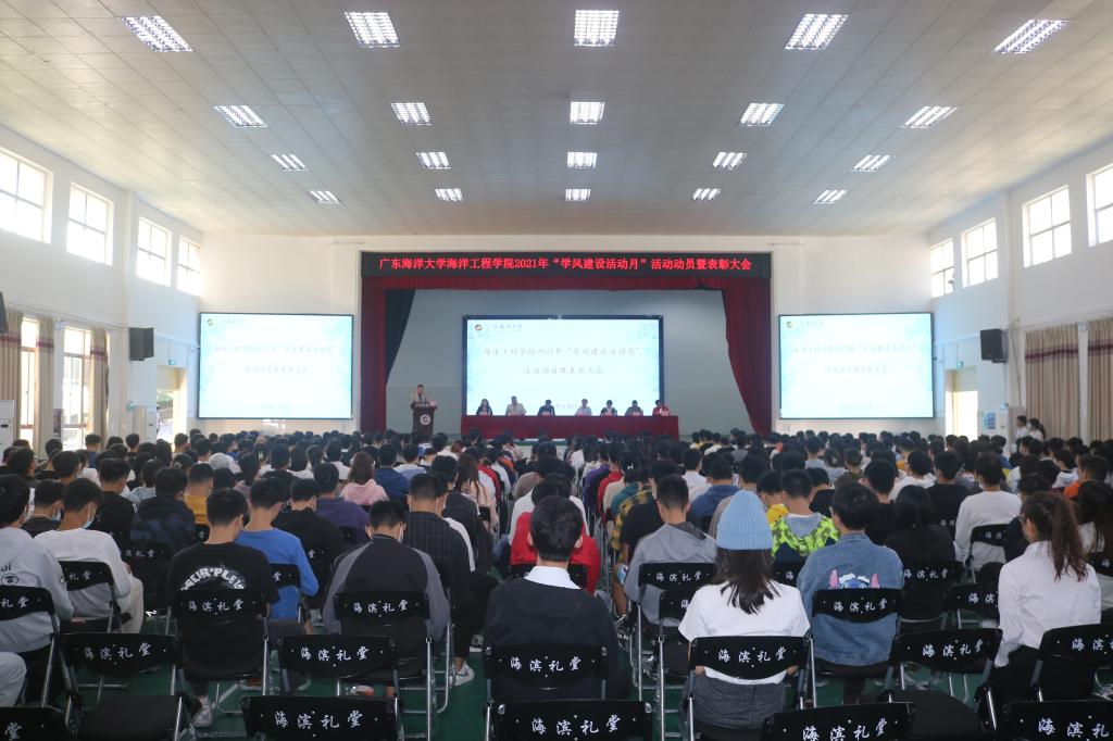 11月10日下午,海洋工程学院在海滨校区小礼堂召开2021年“学风建设活动月”活动动员暨表彰大会,学校教务处处长严谨,学院党政领导、教学系负责人、辅导员以及各班级学生代表共计500余人参加会议。学院党总支副书记尹霞主持会议。