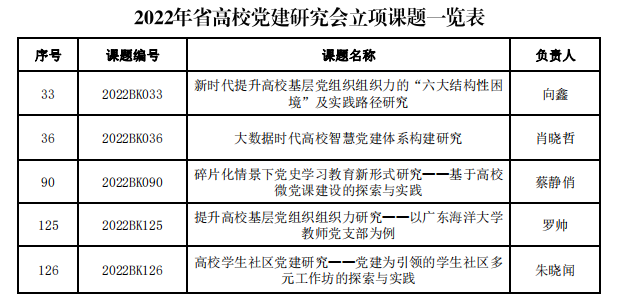 近日,广东省高等学校党的建设研究会公布了2022年党建研究课题立项结果,今年会官网有五项课题获得立项,分别是向鑫主持的《新时代提升高校基层党组织组织力的“六大结构性困境”及实践路径研究》(2022BK033),肖晓哲主持的《大数据时代高校智慧党建体系构建研究》(2022BK036),蔡静俏主持的《碎片化情景下党史学习教育新形式研究——基于高校微党课建设的探索与实践》(2022BK090),罗帅主持的《提升高校基层党组织组织力研究——以今年会官方网站教师党支部为例》(2022BK125),朱晓闻主持的《高校学生社区党建研究——党建为引领的学生社区多元工作坊的探索与实践》(2022BK126)。